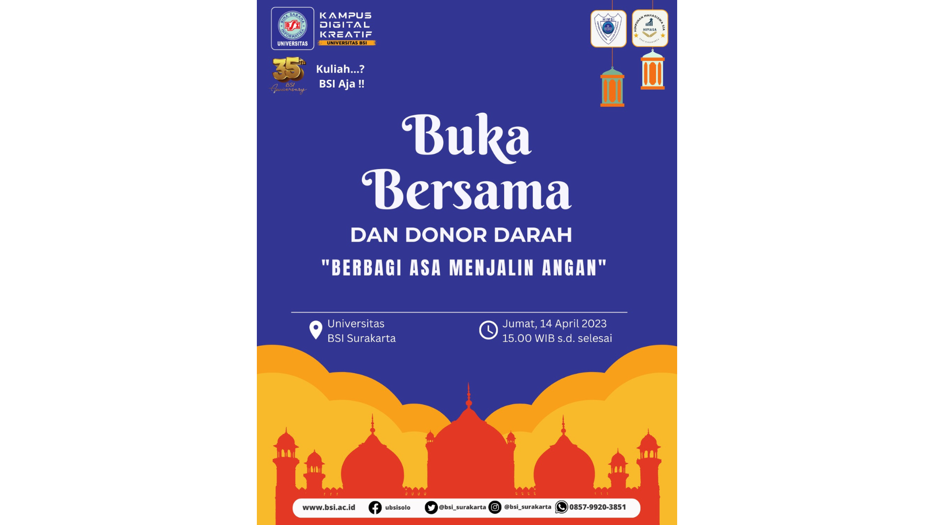 Dalam kegiatan Ramadhan ini, Universitas BSI Kampus Surakarta akan menghadirkan serangkaian acara yang menarik dan bermanfaat bagi peserta. Kegiatan yang akan dilakukan antara lain buka puasa bersama, kajian, donor darah, dan santunan anak yatim.