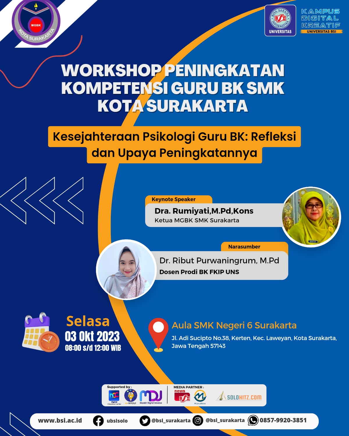 Surakarta, – Majelis Guru Bimbingan dan Konseling (MGBK) Sekolah Menengah Kejuruan (SMK) Kota Surakarta, bekerja sama dengan Universitas BSI Kampus Kota Surakarta, akan menyelenggarakan workshop dengan tema “Kesejahteraan Psikologi Guru BK: Refleksi dan Upaya Peningkatannya”. Acara ini akan berlangsung pada tanggal 3 Oktober 2023 di Aula SMKN 6 Surakarta.