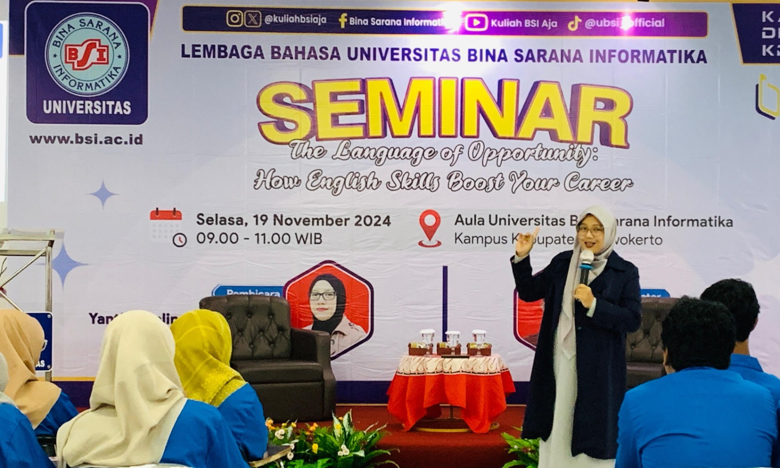 Yanti Rosalinah selaku kepala Lembaga Bahasa Universitas BSI menyampaikan serangkaian acara interaktif yang dirancang untuk meningkatkan kemampuan berbahasa Inggris mahasiswa untuk menunjang karier di dunia kerja serta untuk meningkatkan minat mahasiswa UBSI ikut serta dalam program IISMA 2025.