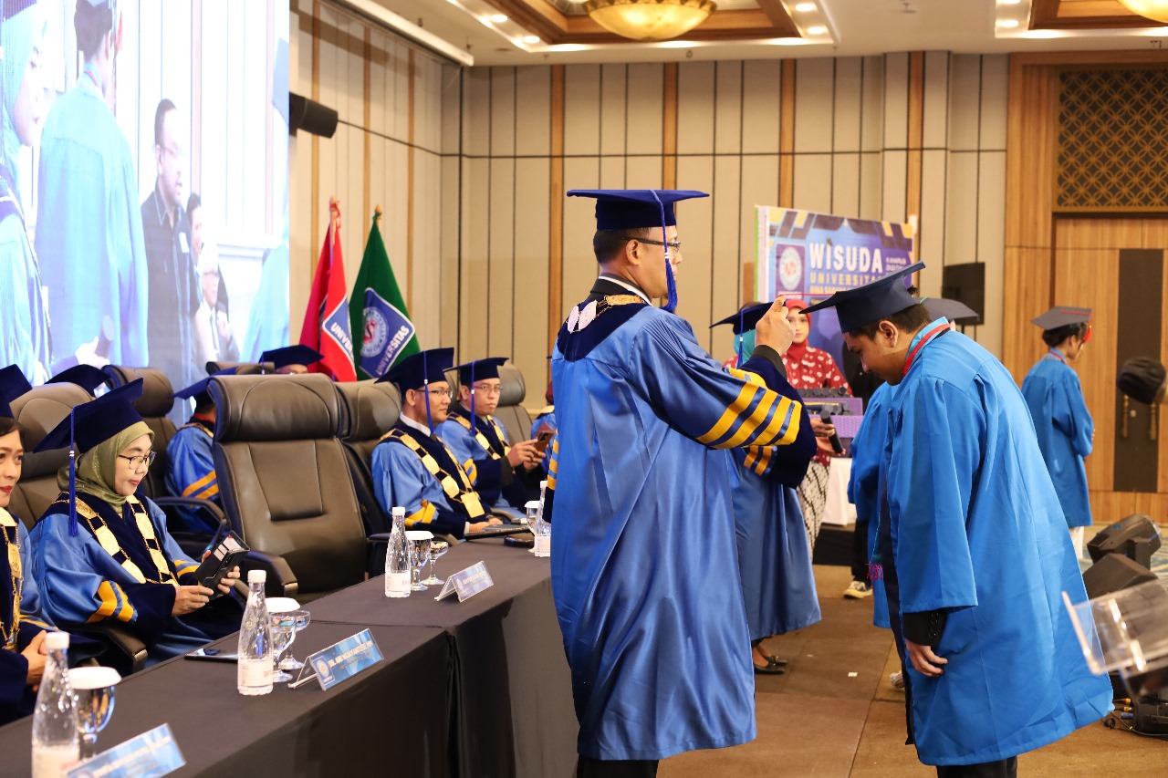 Puncak acara? Tentu saja saat topi toga melayang di udara. Dengan aba-aba penuh semangat dari MC, hitungan “1… 2… 3!” mengubah langit-langit ballroom menjadi festival mini.