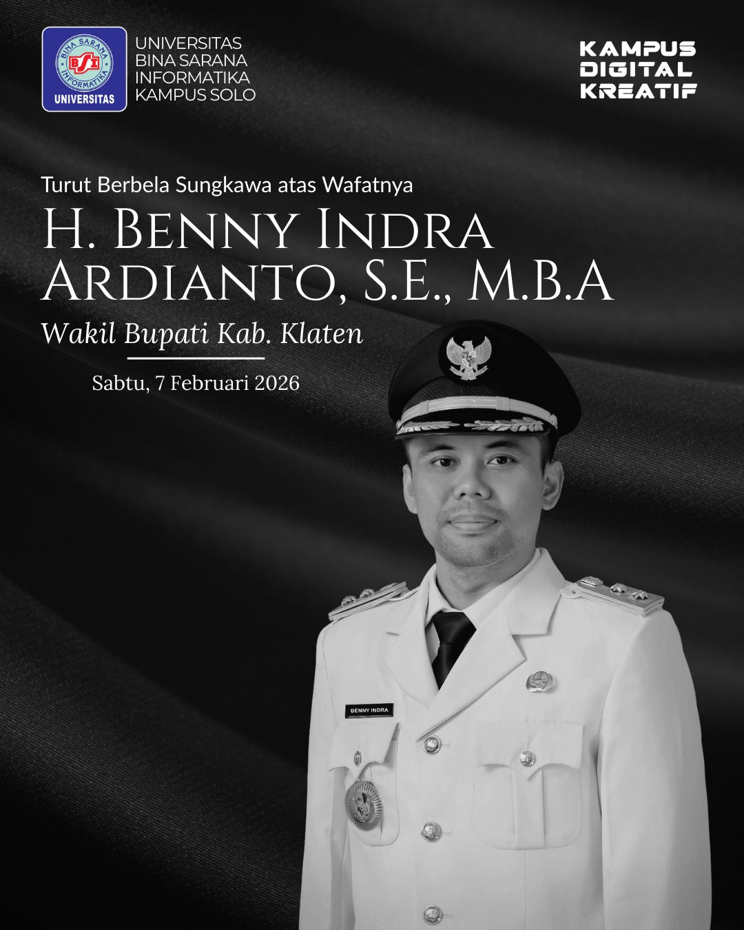 KLATEN — Kabar duka mendalam menyelimuti Kabupaten Klaten setelah Wakil Bupati Klaten, Benny Indra Ardhianto, menghembuskan nafas terakhirnya pada Sabtu siang (7/2/2026) di RSUP Dr Kariadi Semarang. Almarhum meninggal dunia saat menjalani perawatan medis di rumah sakit tersebut.